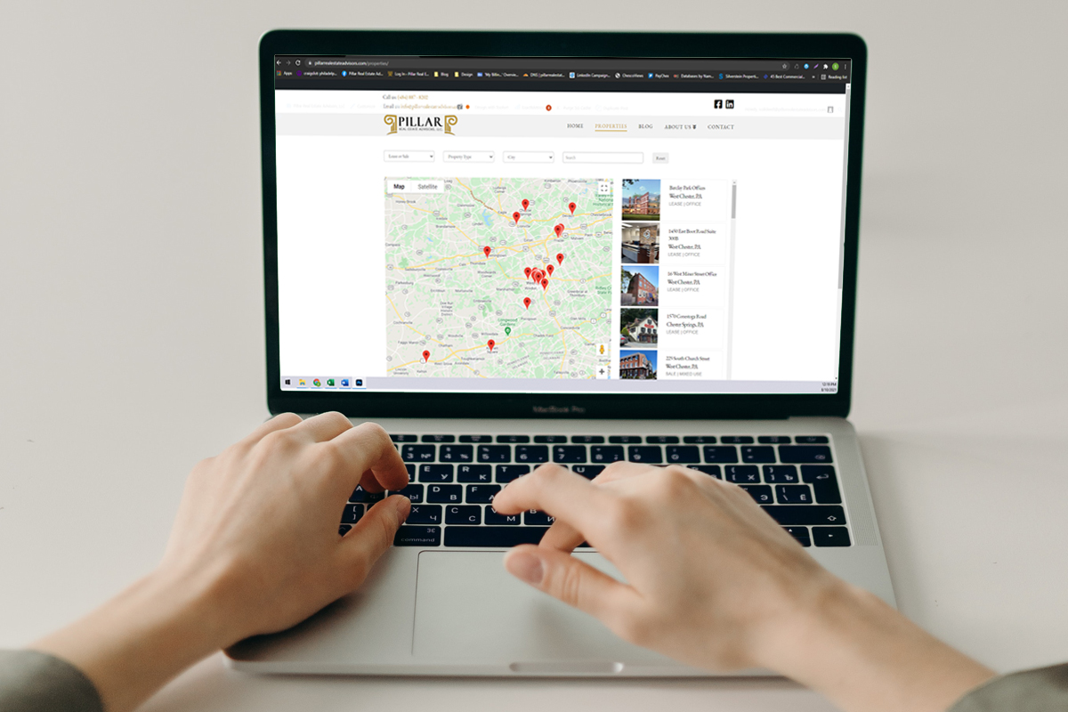 Pillar Real Estate Advisors has made your search easier. We have a sizable listing of commercial real estate found in various counties in Pennsylvania. We offer listings of several different commercial property types, including Flex, Industrial, Land, Mixed Use, Office, and Retail properties.hands on a laptop keyboard with the screen displaying commercial real estate listings on a map[/cs_content_seo]